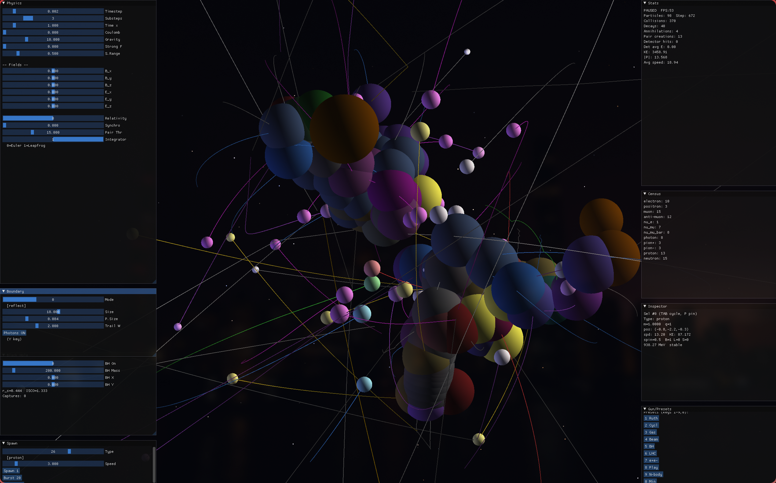Real-Time GPU Particle Physics Simulation with PDG-accurate particle catalog.